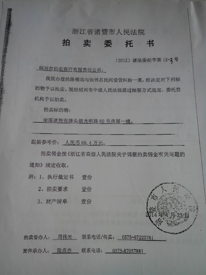 坐落于诸暨市牌头镇光明路60号房屋一幢,建筑面积634.10m2,起拍参考价68.4万元。